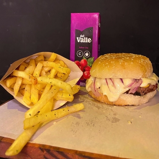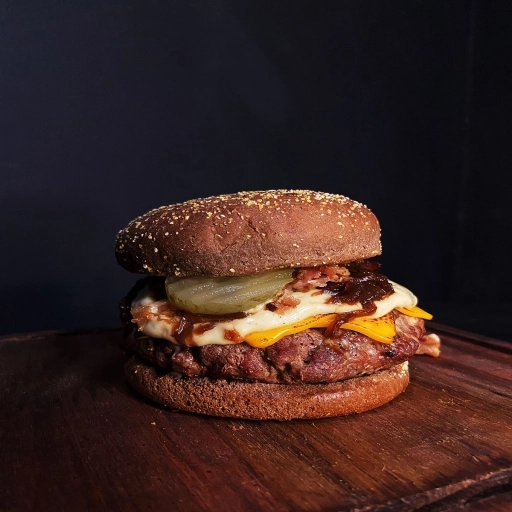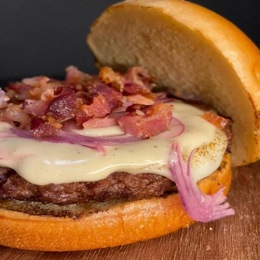 Carne de picanha de 90g no pão com gergelim, cheddar, cebola roxa e nosso molho exclusivo defumado.