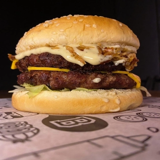2 Carnes de costela de 120g cada, Pão com gergelim, 2 cheddar, Cebola Cryspe e molho defumado e Alface americano.
